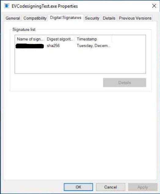 - Uma vez que a janela de propriedades tenha sido aberta, clique no menu rotulado "Assinaturas digitais", que exibirá o certificado de assinatura de código da sua empresa.